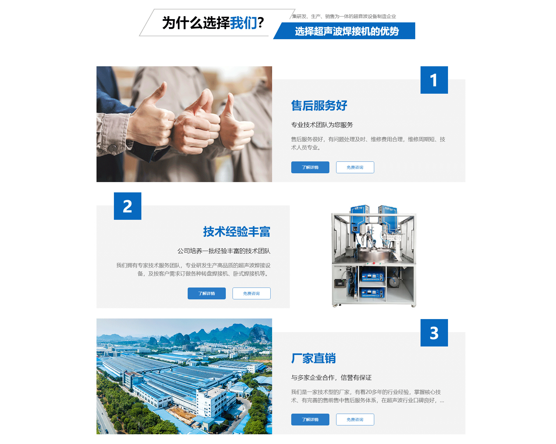 关于我们厦门劲荣机械设备有限公司是一家集研发、生产、销售为一体的超音波设备制造企业,主要产品包括多规格型号的超音波塑胶熔接机、热板式塑料焊接机、多工位转盘焊接机、振动摩擦焊接机、旋转式塑胶熔接机及配套的工装夹具等。公司自2003年成立以来,一直致力于产品不断完善中,并追求产品的精益求精,于2004年向国家商标局注册了“劲荣”牌商标,2009年荣获厦门市商标。 经过多年的努力,公司已经发展成为占地面积2000余平方米、拥有员工50余人的企业。公司一直将“品质是企业发展的原动力”作为经营理念,严把质量关,建立了一整套有效的安全生产及管理模式,不仅赢得了同行的认可,更取得了客户的信赖,先后与九牧集团、路达工业、建霖集团、西伯电子、蒙发利实业、松霖科技、铱科集团、科司特电子等公司建立了长期的合作关系。 面对已经取得的成绩,我们不骄不满,因为深知业绩只能代表过去,只有靠良好的产品质量和完善的售后服务才能在客户中口碑相传,在...